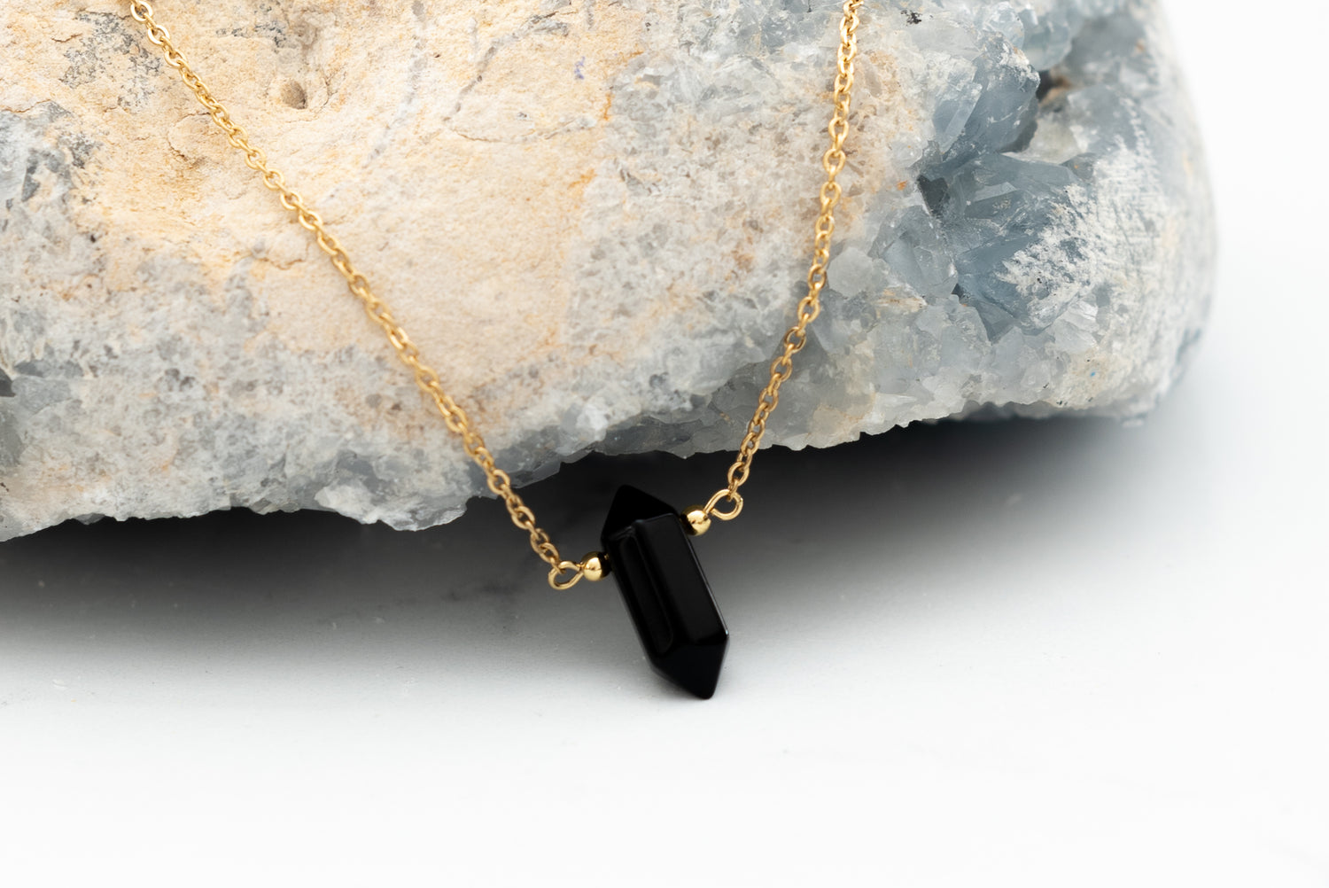 18 inch, 18K gold plated necklace with mini, double terminated crystal
